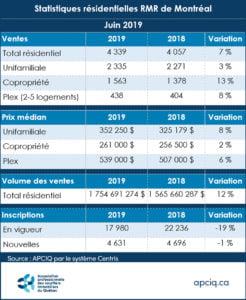 L’Île-des-Sœurs, le 5 juillet 2019 – L’Association professionnelle des courtiers immobiliers du Québec (APCIQ) vient de publier les plus récentes statistiques du marché immobilier résidentiel de la région métropolitaine de recensement (RMR) de Montréal, établies d’après la base de données provinciale Centris des courtiers immobiliers.