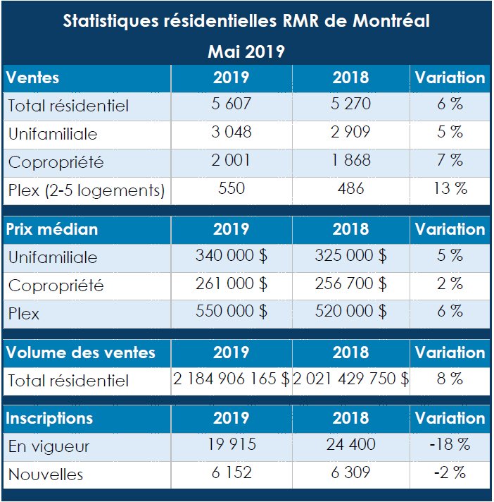 L’Île-des-Sœurs, le 6 juin 2019 – L’Association professionnelle des courtiers immobiliers du Québec (APCIQ) vient de publier les plus récentes statistiques du marché immobilier résidentiel de la région métropolitaine de recensement (RMR) de Montréal, établies d’après la base de données provinciale Centris des courtiers immobiliers.