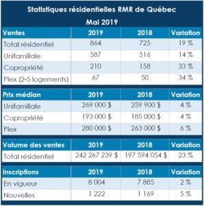 Québec, le 6 juin 2019 – L’Association professionnelle des courtiers immobiliers du Québec (APCIQ) vient de publier les plus récentes statistiques du marché immobilier résidentiel de la région métropolitaine de recensement (RMR) de Québec, établies d’après la base de données provinciale Centris des courtiers immobiliers.