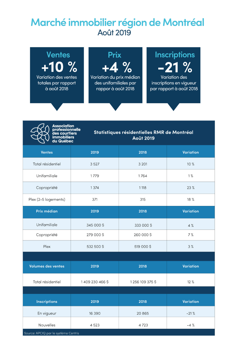 L’Île-des-Sœurs, le 6 septembre 2019 – L’Association professionnelle des courtiers immobiliers du Québec (APCIQ) vient de publier les plus récentes statistiques du marché immobilier résidentiel de la région métropolitaine de recensement (RMR) de Montréal, établies d’après la base de données provinciale Centris des courtiers immobiliers.