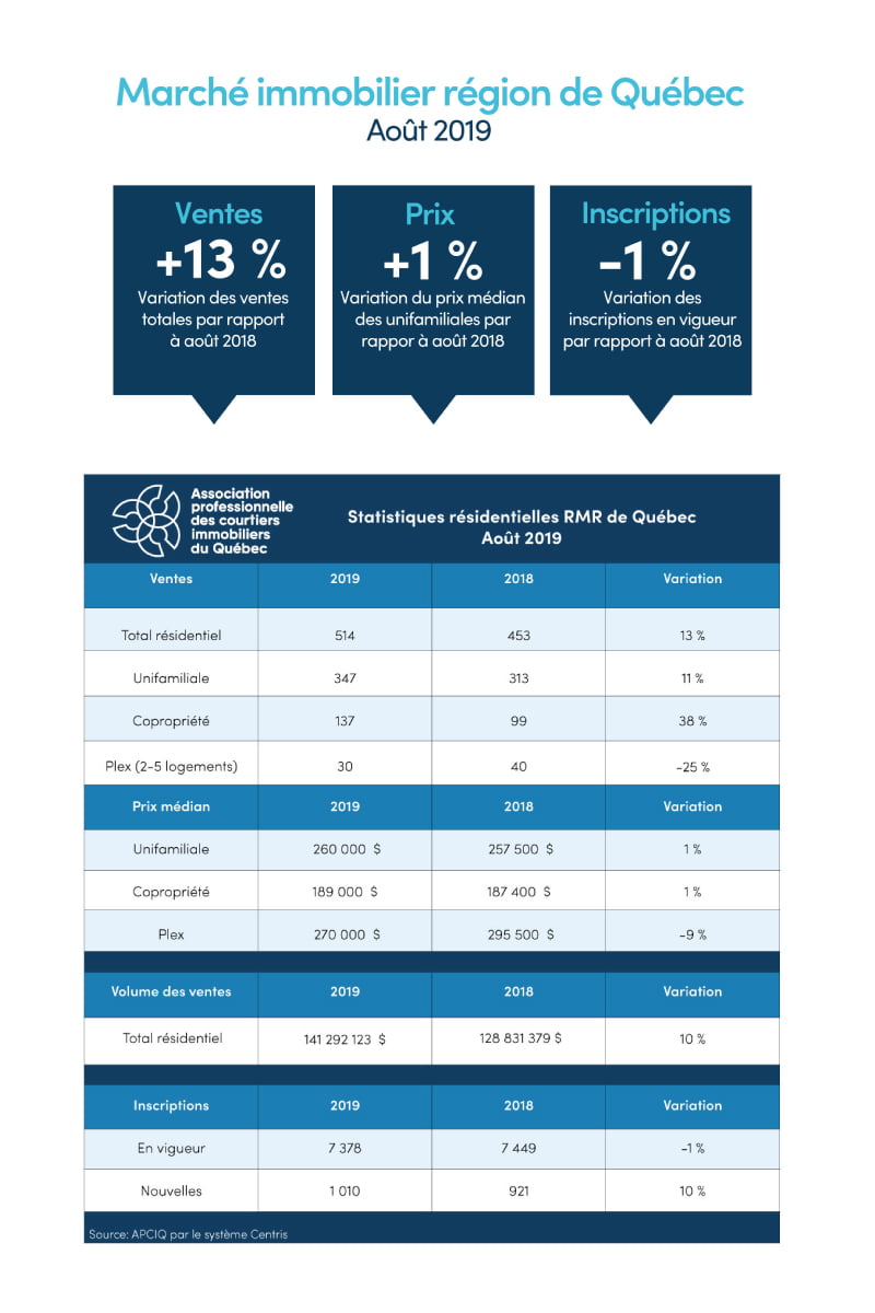 Québec, le 6 septembre 2019 – L’Association professionnelle des courtiers immobiliers du Québec (APCIQ) vient de publier les plus récentes statistiques du marché immobilier résidentiel de la région métropolitaine de recensement (RMR) de Québec, établies d’après la base de données provinciale Centris des courtiers immobiliers.