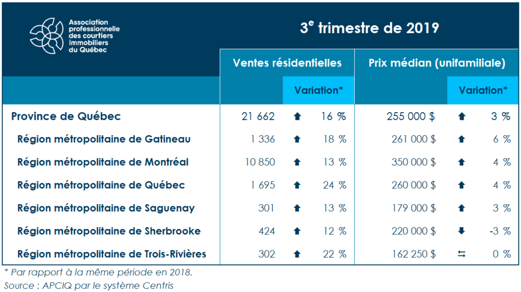 L’Île-des-Sœurs, le 24 octobre 2019 — L’Association professionnelle des courtiers immobiliers du Québec (APCIQ) vient de publier les plus récentes statistiques du marché immobilier résidentiel de la province de Québec, établies d’après la base de données provinciale Centris des courtiers immobiliers. Ainsi, 21 662 ventes ont été réalisées au Québec de juillet à septembre, ce qui constitue un record pour cette période de l’année et une progression de 16 % par rapport au troisième trimestre de 2018. Une telle hausse n’avait pas été enregistrée depuis le 3e trimestre de 2003. Ceci porte à 21 le nombre de trimestres consécutifs de croissance de l’activité sur le marché résidentiel québécois.