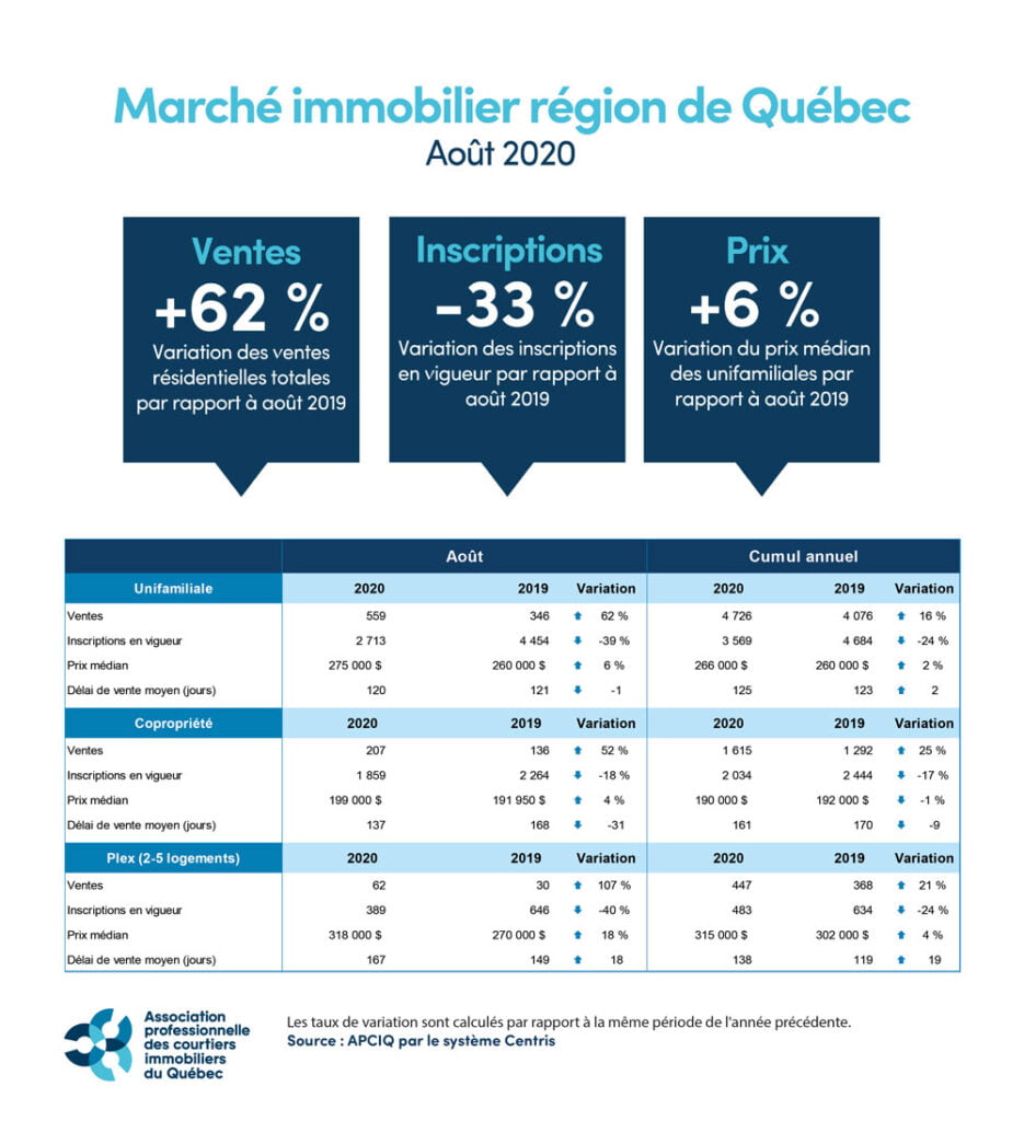 Québec, le 4 septembre 2020 – L’Association professionnelle des courtiers immobiliers du Québec (APCIQ) vient de publier les plus récentes statistiques du marché immobilier résidentiel de la région métropolitaine de recensement (RMR) de Québec, établies d’après la base de données provinciale Centris des courtiers immobiliers.