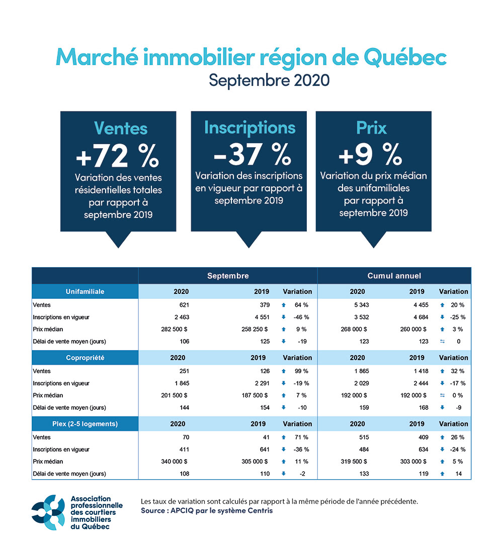 Québec, le 7 octobre 2020 – L’Association professionnelle des courtiers immobiliers du Québec (APCIQ) vient de publier les plus récentes statistiques du marché immobilier résidentiel de la région métropolitaine de recensement (RMR) de Québec, établies d’après la base de données provinciale Centris des courtiers immobiliers.
