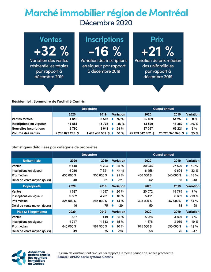 L’Île-des-Sœurs, le 5 janvier 2021 – L’Association professionnelle des courtiers immobiliers du Québec (APCIQ) dévoile ses données pour le mois de décembre. Les plus récentes statistiques du marché immobilier résidentiel de la région métropolitaine de recensement (RMR) de Montréal sont établies d’après la base de données provinciale Centris des courtiers immobiliers.