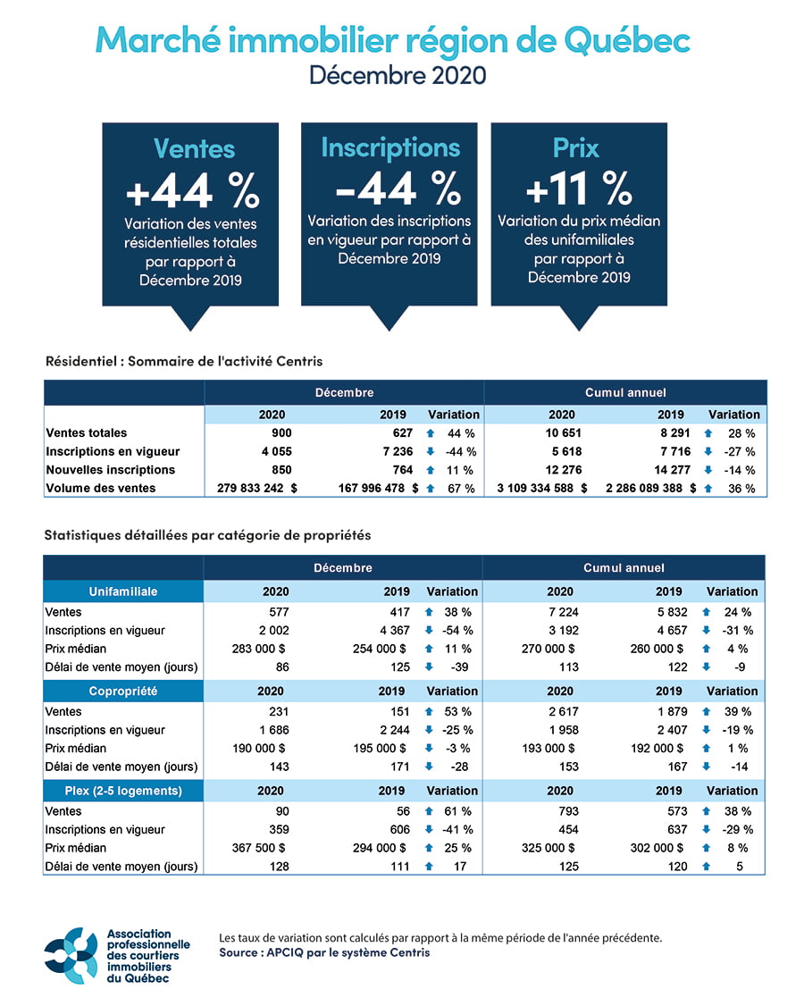 Québec, le 5 janvier 2021 – L’Association professionnelle des courtiers immobiliers du Québec (APCIQ) dévoile ses données pour le mois de décembre. Les plus récentes statistiques du marché immobilier résidentiel de la région métropolitaine de recensement (RMR) de Québec sont établies d’après la base de données provinciale Centris des courtiers immobiliers.