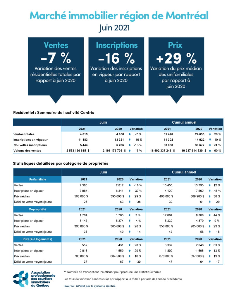 L’Île-des-Sœurs, le 6 juillet 2021 – L’Association professionnelle des courtiers immobiliers du Québec (APCIQ) dévoile ses données pour le mois de juin. Les plus récentes statistiques du marché immobilier résidentiel de la région métropolitaine de recensement (RMR) de Montréal sont établies d’après la base de données provinciale Centris des courtiers immobiliers.