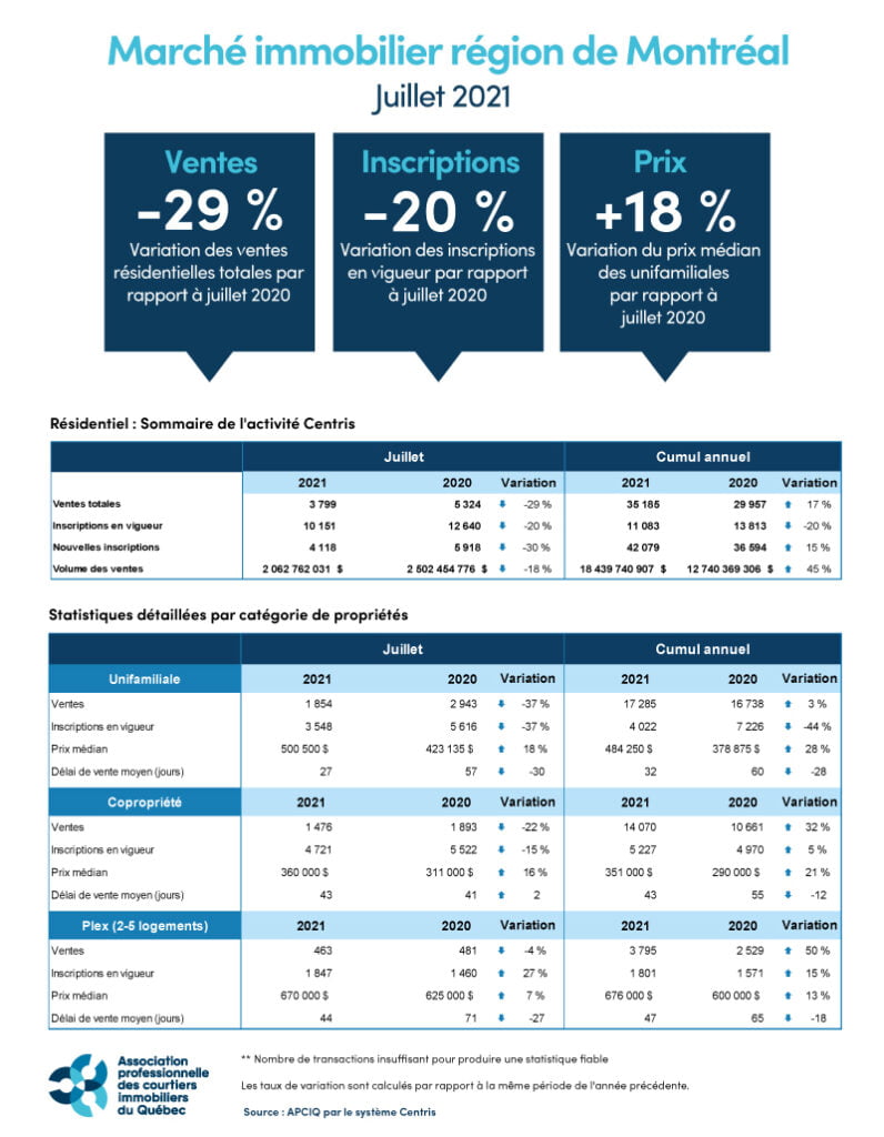 L’Île-des-Sœurs, le 4 août 2021– L’Association professionnelle des courtiers immobiliers du Québec (APCIQ) dévoile ses données pour le mois de juillet. Les plus récentes statistiques du marché immobilier résidentiel de la région métropolitaine de recensement (RMR) de Montréal sont établies d’après la base de données provinciale Centris des courtiers immobiliers.