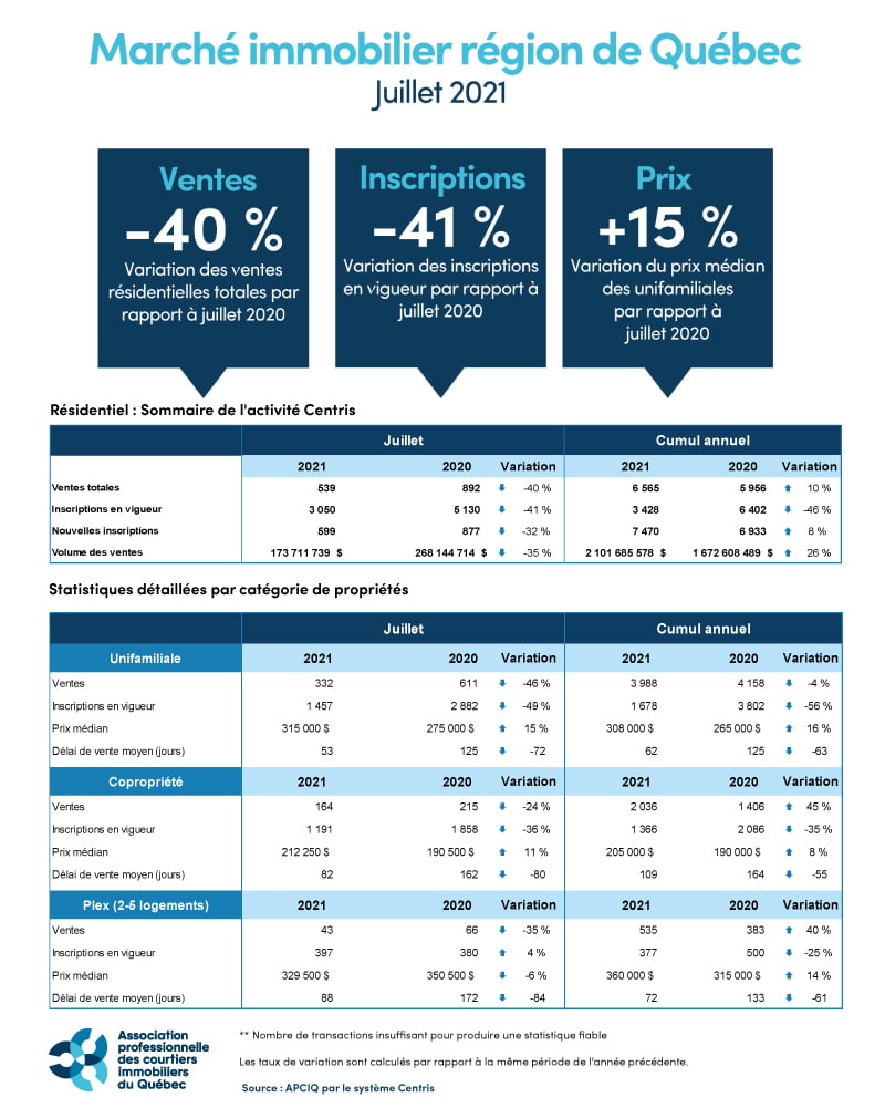 Québec, le 4 août 2021– L’Association professionnelle des courtiers immobiliers du Québec (APCIQ) dévoile ses données pour le mois de juillet. Les plus récentes statistiques du marché immobilier résidentiel de la région métropolitaine de recensement (RMR) de Québec sont établies d’après la base de données provinciale Centris des courtiers immobiliers.