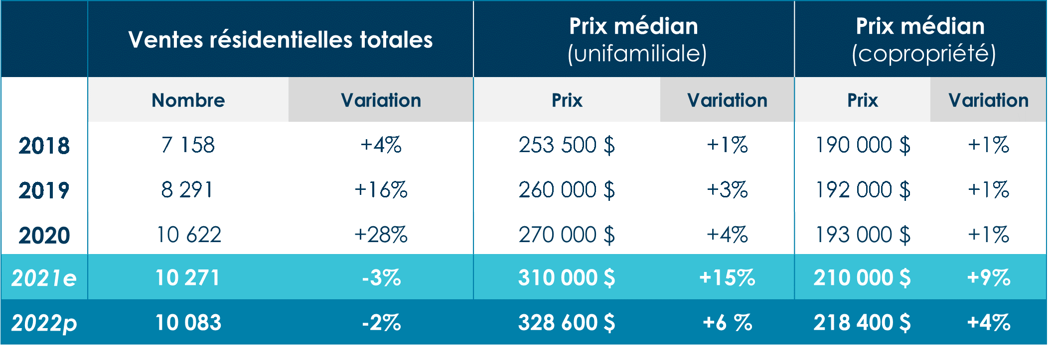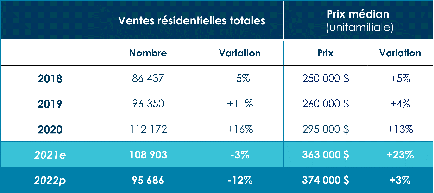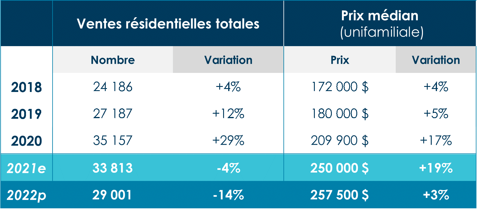 L’année 2021 a enregistré une baisse des ventes de 3 %, concédant à 2020, « l’année pandémique », le titre d’année record à ce chapitre. Avec une estimation de 108 000 ventes selon le système Centris des courtiers immobiliers, 2021 se positionne néanmoins comme la deuxième année la plus active jamais enregistrée.