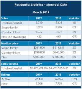L’Île-des-Sœurs, April 8, 2019 – The Quebec Professional Association of Real Estate Brokers (QPAREB) has just released its most recent residential real estate market statistics for the Montreal Census Metropolitan Area (CMA), based on the real estate brokers’ Centris provincial database.