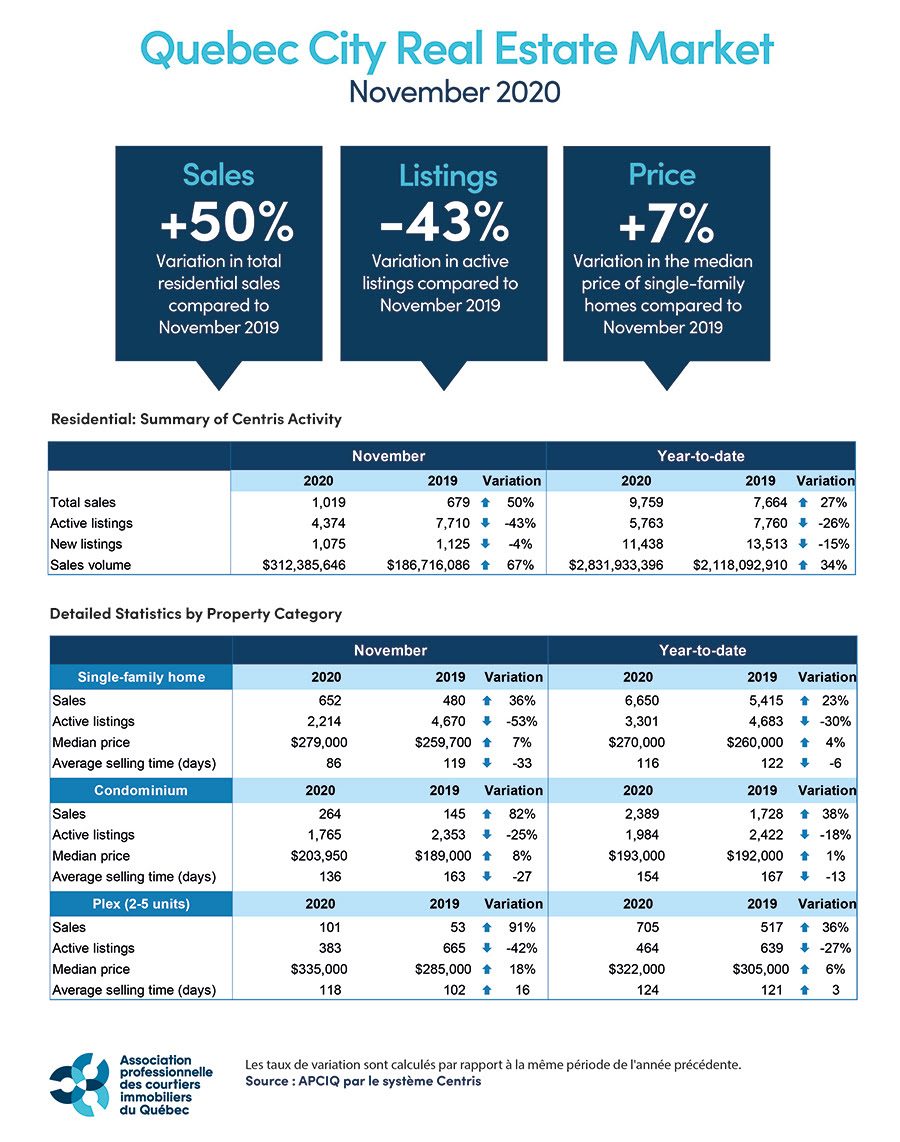 Quebec City, December 3, 2020 – The Quebec Professional Association of Real Estate Brokers (QPAREB) has just released its residential real estate market statistics for the Quebec City Census Metropolitan Area (CMA) for the month of November, based on the real estate brokers’ Centris provincial database.