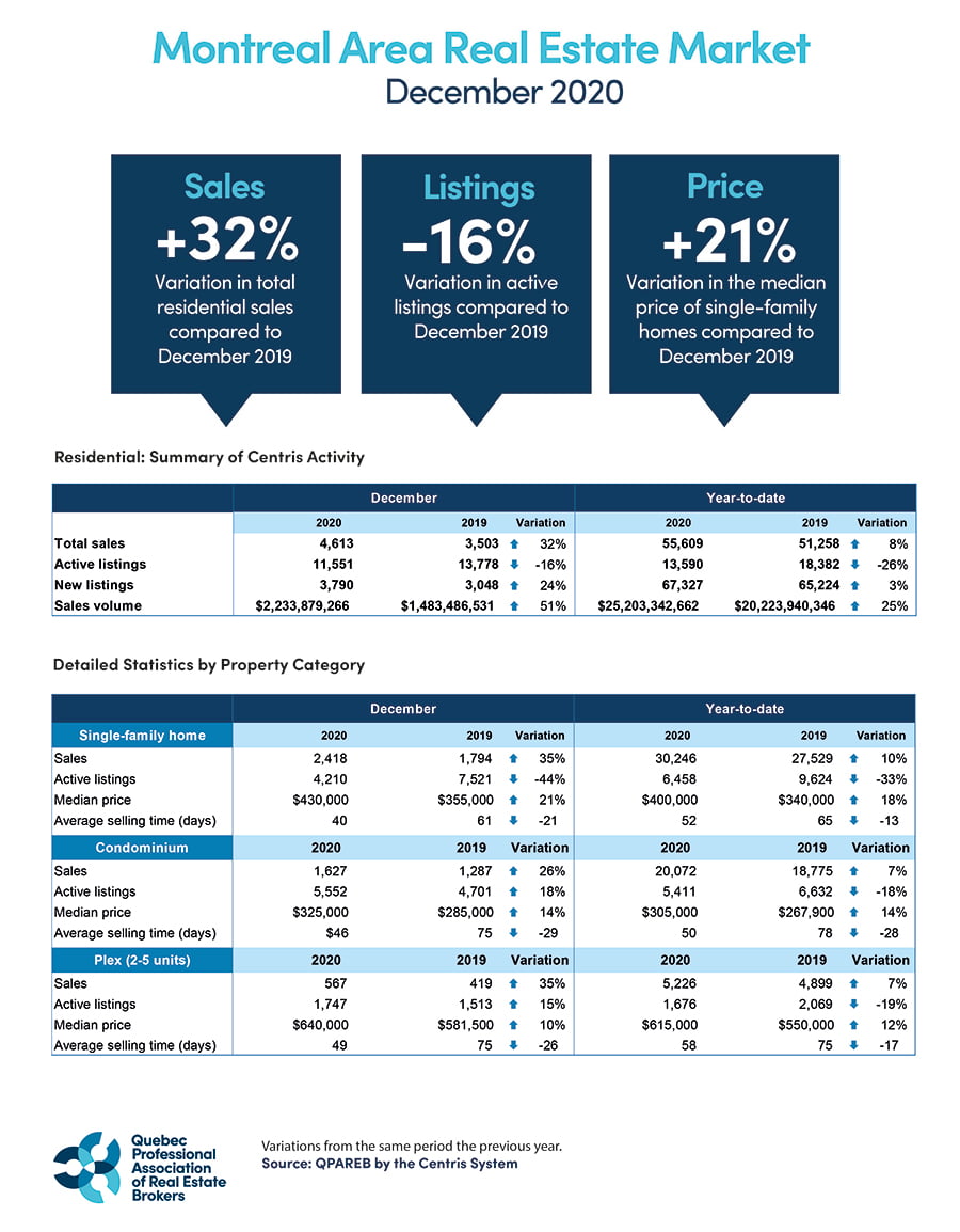L’Île-des-Sœurs, January 5, 2021 – The Quebec Professional Association of Real Estate Brokers (QPAREB) has just released its residential real estate market statistics for the Montreal Census Metropolitan Area (CMA) for the month of December, based on the real estate brokers’ Centris provincial database.