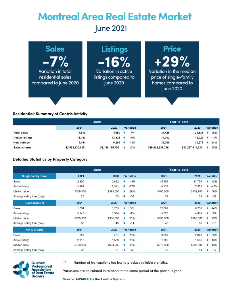 L’Île-des-Sœurs, July 6, 2021 – The Quebec Professional Association of Real Estate Brokers (QPAREB) has just released its residential real estate market statistics for the Montreal Census Metropolitan Area (CMA) for the month of June, based on the real estate brokers’ Centris provincial database.
