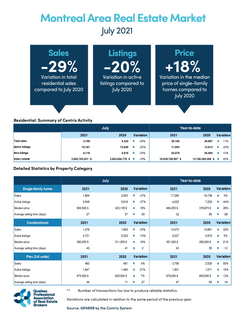 L’Île-des-Sœurs, August 4, 2021 – The Quebec Professional Association of Real Estate Brokers (QPAREB) has just released its residential real estate market statistics for the Montreal Census Metropolitan Area (CMA) for the month of July, based on the real estate brokers’ Centris provincial database.