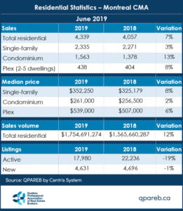 L’Île-des-Sœurs, July 5, 2019 – The Quebec Professional Association of Real Estate Brokers (QPAREB) has just released its most recent residential real estate market statistics for the Montreal Census Metropolitan Area (CMA), based on the real estate brokers’ Centris provincial database.