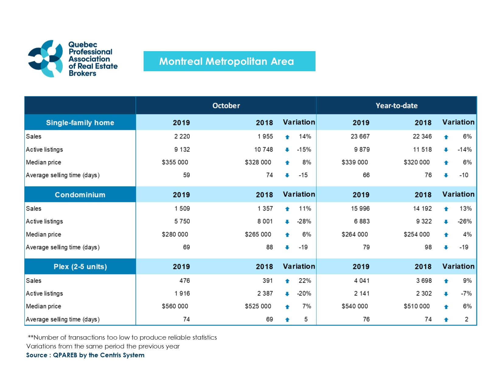 L’Île-des-Sœurs, November 6, 2019 – The Quebec Professional Association of Real Estate Brokers (QPAREB) has just released its most recent residential real estate market statistics for the Montreal Census Metropolitan Area (CMA), based on the real estate brokers’ Centris provincial database.