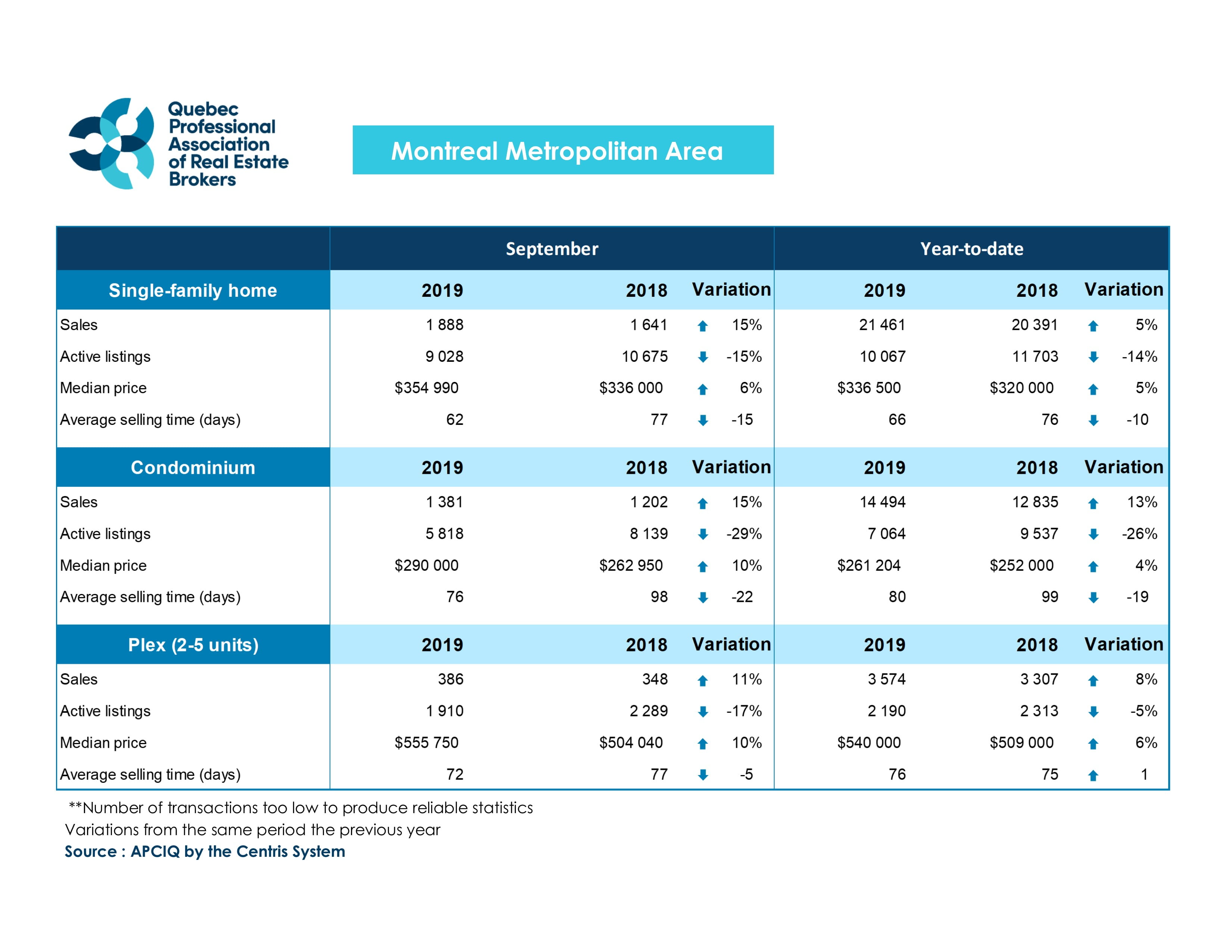 L’Île-des-Sœurs, October 4, 2019 – The Quebec Professional Association of Real Estate Brokers (QPAREB) has just released its most recent residential real estate market statistics for the Montreal Census Metropolitan Area (CMA), based on the real estate brokers’ Centris provincial database.