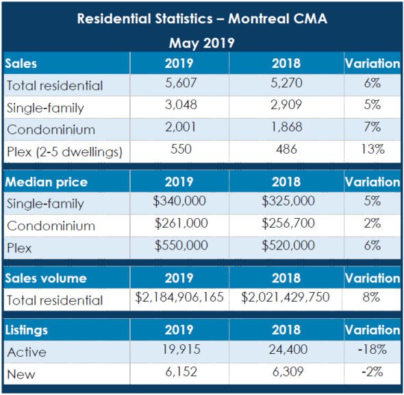 L’Île-des-Sœurs, June 6, 2019 – The Quebec Professional Association of Real Estate Brokers (QPAREB) has just released its most recent residential real estate market statistics for the Montreal Census Metropolitan Area (CMA), based on the real estate brokers’ Centris provincial database.