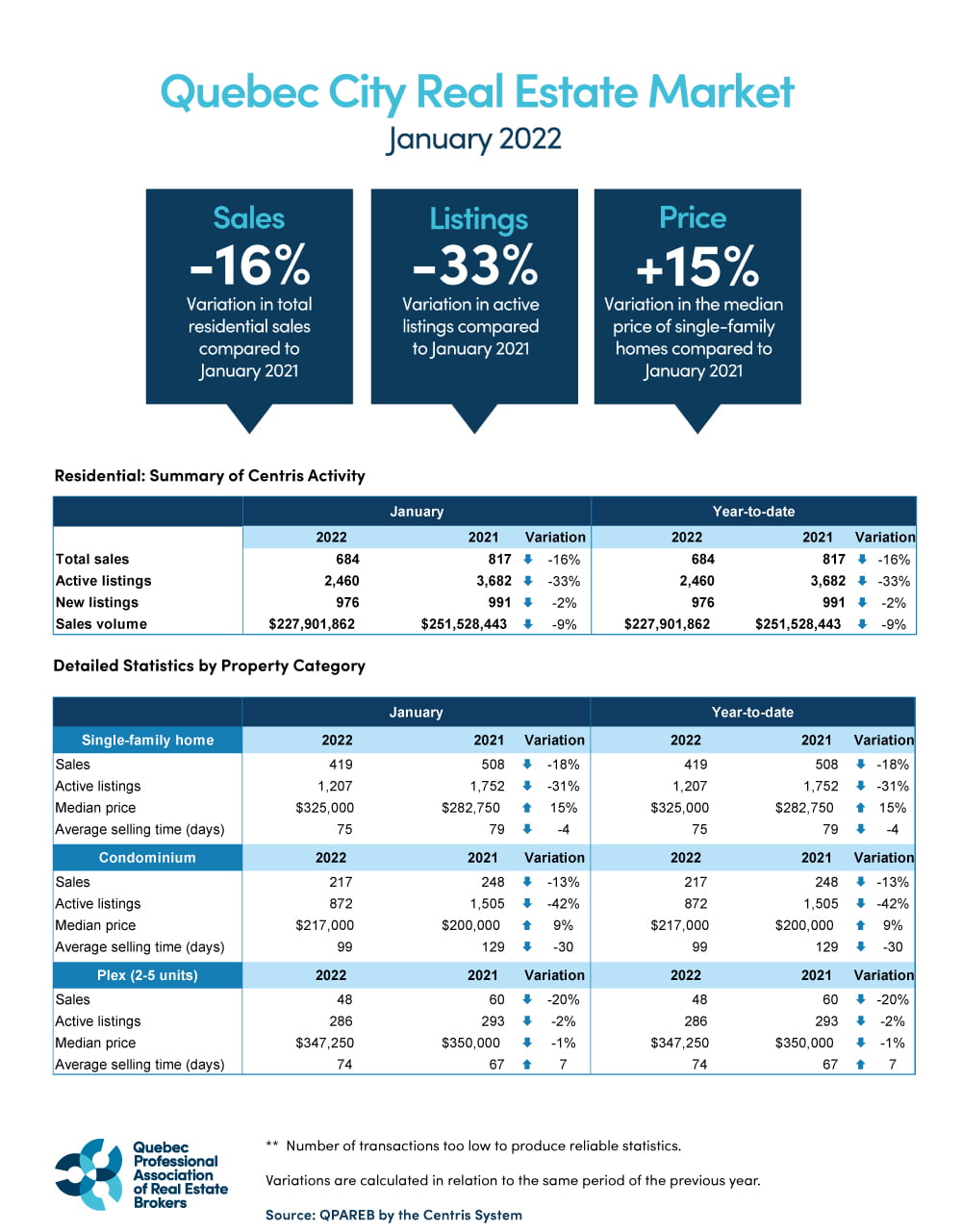 Quebec City, February 4, 2022 – The Quebec Professional Association of Real Estate Brokers (QPAREB) has just released its residential real estate market statistics for the Quebec City Census Metropolitan Area (CMA) for the month of January, based on the real estate brokers’ Centris provincial database.