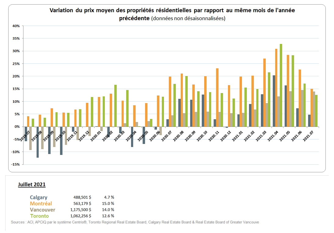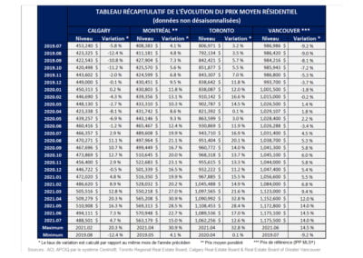 Le marché de Montréal enregistre un nouveau record de hausse des prix des propriétés résidentielles, suivi de près par Toronto. Dans le cas de Toronto, le prix moyen d’une maison unifamiliale a dépassé les 1M $ en février 2021, témoignant d’une forte surchauffe du marché menant à sa surévaluation. Ce n’est pas encore le cas à Montréal mais au rythme de croissance des prix connu depuis juillet 2020, les risques de dérive vers la surévaluation augmentent de mois en mois.