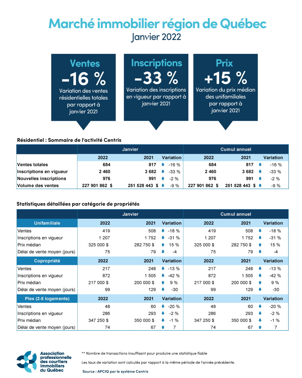 Québec, le 4 février 2022 – L’Association professionnelle des courtiers immobiliers du Québec (APCIQ) dévoile ses données pour le mois de janvier. Les plus récentes statistiques du marché immobilier résidentiel de la région métropolitaine de recensement (RMR) de Québec sont établies d’après la base de données provinciale Centris des courtiers immobiliers.