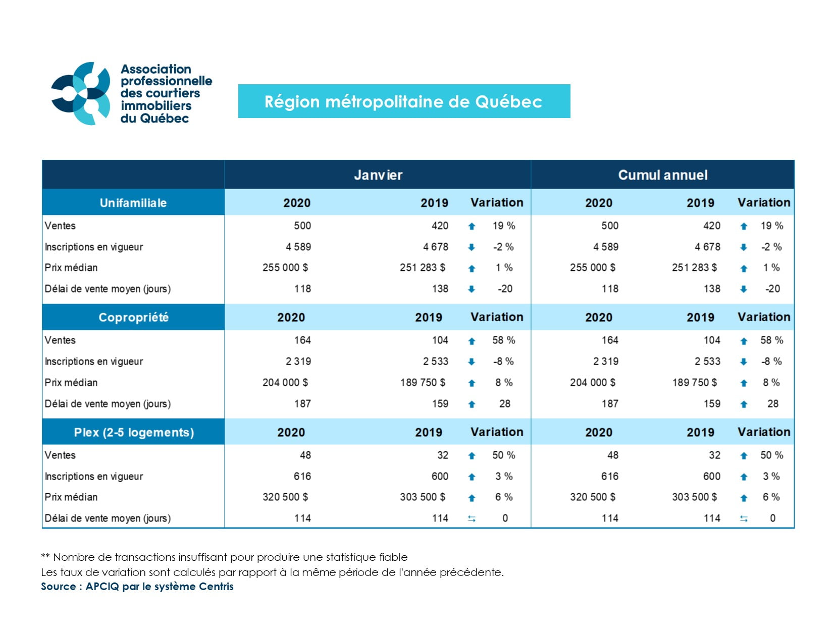 Québec, le 6 février 2020 – L’Association professionnelle des courtiers immobiliers du Québec (APCIQ) vient de publier les plus récentes statistiques du marché immobilier résidentiel de la région métropolitaine de recensement (RMR) de Québec, établies d’après la base de données provinciale Centris des courtiers immobiliers.