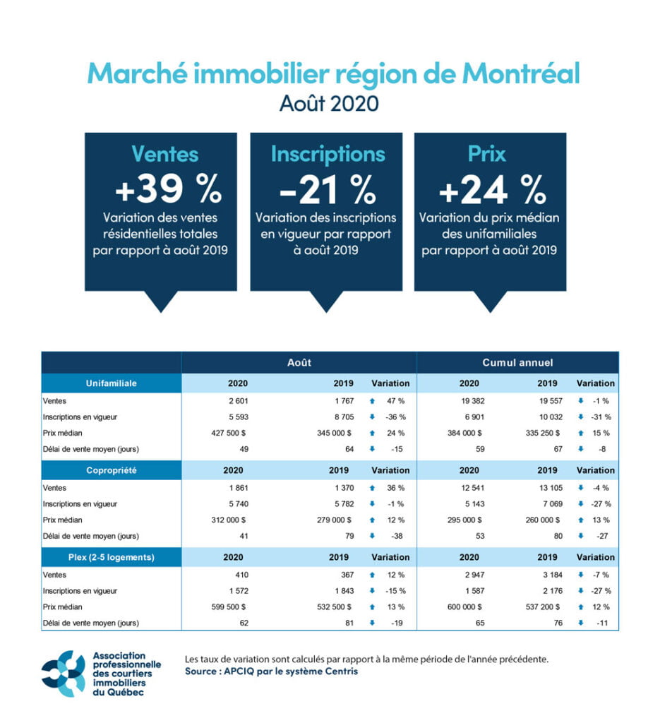 L’Île-des-Sœurs, le 4 septembre 2020 – L’Association professionnelle des courtiers immobiliers du Québec (APCIQ) vient de publier les plus récentes statistiques du marché immobilier résidentiel de la région métropolitaine de recensement (RMR) de Montréal, établies d’après la base de données provinciale Centris des courtiers immobiliers.